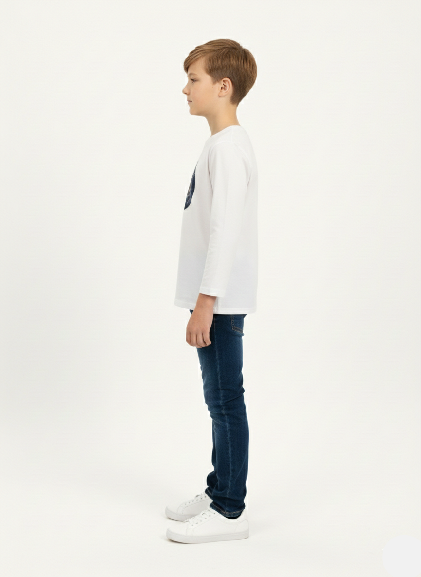 Shop boys white full sleeve graphic T-shirt featuring a bold racing helmet print. Made from soft, breathable cotton for all-day comfort. Perfect for school, casual wear, and everyday style. Trendy design with a regular fit for active kids.