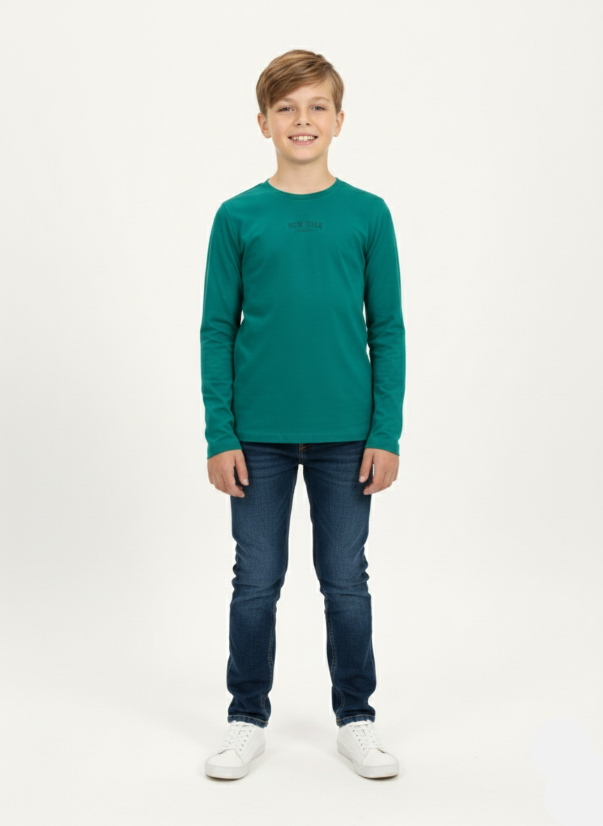 Shop boys green full sleeve T-shirt made from soft, breathable cotton for all-day comfort. Featuring a classic round neck and regular fit, perfect for casual wear, school, and everyday style.